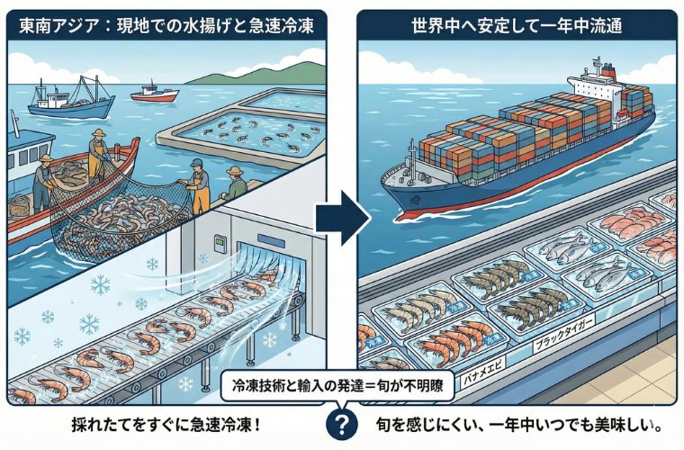 スーパーでよく見る「バナメイえび」や「ブラックタイガー」。これらは主に東南アジアからの輸入・冷凍品です。現地で獲れた(養殖された)後、すぐに冷凍されるため、特定の「旬」を感じにくく、一年中安定して流通しています。