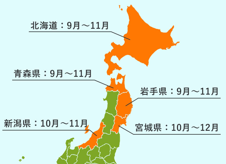 北海道についで水揚げの多い青森県、岩手県の旬は9~11月です。 次に多いのが宮城県。「はらこ飯」などの名物があります。宮城県の旬は少し遅れて10~12月となります。 村上市などの塩引き鮭が有名な新潟県も忘れてはいけません。新潟県は10~11月、中でも11月が最盛期です。秋鮭とは呼ぶものの、産地によっては冬まで漁が続きます。北海道以外では「いくら=秋」だけが旬と言えません。産地とセットになることを覚えておいてください。
