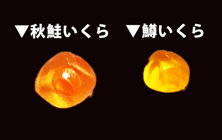 上の画像で左側が「秋鮭いくら」、右側が「鱒いくら」です。 並べると、粒の大きさが一回り以上違うことがわかります。
