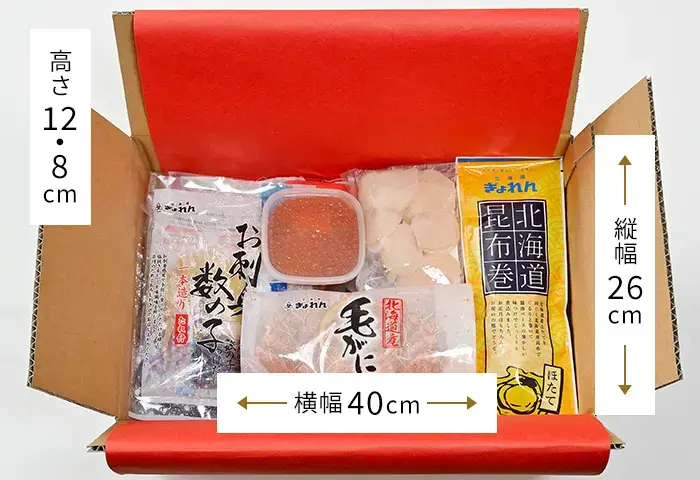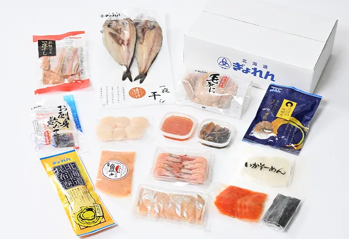 浜ゆで毛がに(1尾):400g、いくら醤油漬:60g、紅鮭スモークサーモン:80g、甘えび:100g、ほたて貝柱(刺身用):150g、真ほっけ開き(2枚):300g、いかそーめん:55g、秋鮭ハラススライス(刺身用):100g、お刺身数の子:40g、ほたて昆布巻:1本、数の子松前漬:50g、鮭とろ:120g、秋鮭ハラス一夜干し:220g、さばの味噌煮:130g、なが昆布:10g