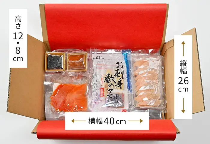 特大真ほっけ開き1枚:600g、豊西牛ローストビーフ:200g、紅鮭親子ルイベ:180g、いくら醤油漬:60g、紅鮭スモークサーモン:80g、ほたて貝柱(刺身用):150g、ヒラメ(刺身用):110g、いかそーめん:55g、たこ薄造り(刺身用):70g、秋鮭ハラススライス(刺身用):100g、甘えび(刺身用):100g、お刺身数の子:40g、ほたて昆布巻:1本、伊達巻(4切):約80g、数の子松前漬:50g、鮭とろ:120g、昆布〆いわし:60g、ほたてステーキ(4個):40g、しめさば:1枚、さばの味噌煮:130g、なが昆布:10g