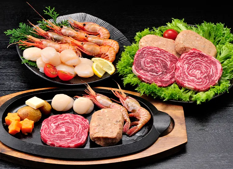 | お召し上がり方 | 解凍後、ステーキとハンバーグは火を通してお召し上がりください。 ボタンえび、ほたて貝柱は解凍後そのままお召し上がりいただけます。 |