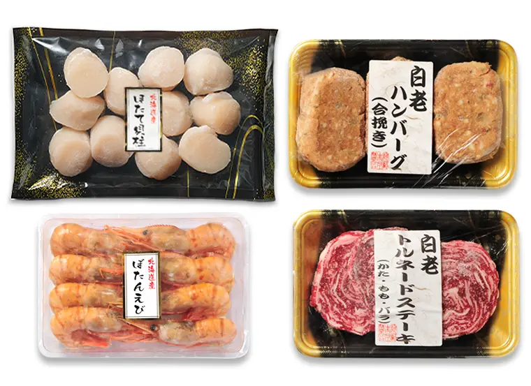 | 内容量 | 白老トルネードステーキ:60g×3 白老ハンバーグ:100g×3 刺身用ほたて貝柱:200g 刺身用ぼたんえび:160g |