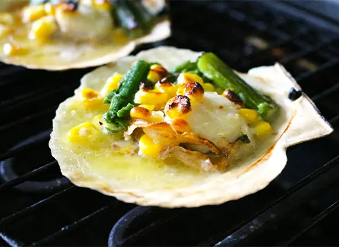 ほたての旨みと甘み、バターのコク、アスパラとコーンの風味が口の中で広がります。焼き上がりに醤油を垂らせば、香ばしさが増して、いっそう美味しく召し上がれます。