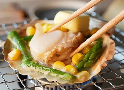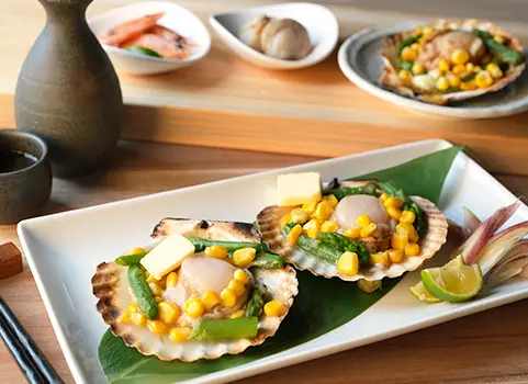 北海道産のほたてに、アスパラとコーンを添えた本格バター焼き。付属のバターが旨みを引き立てます。年間約10,000枚以上出荷している人気の一品です。