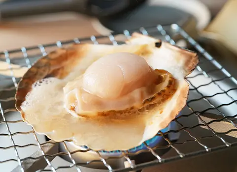 ② 炭火やガスコンロの上に網を敷いて(魚焼きグリルでも可)、弱火でほたてに少し火を通します。