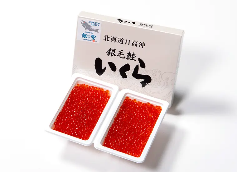 北海道 日高地方のブランド秋鮭『銀聖(ぎんせい)』からとれた鮭卵をいくら醤油漬けに仕上げた商品です。