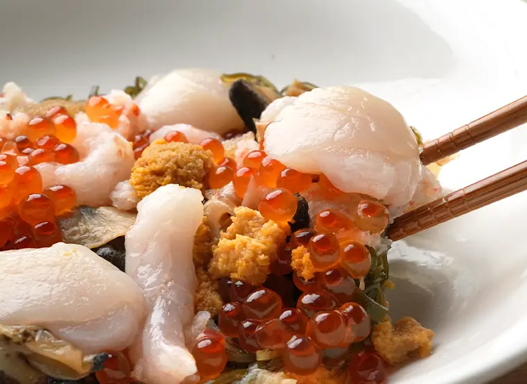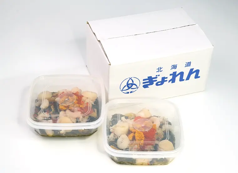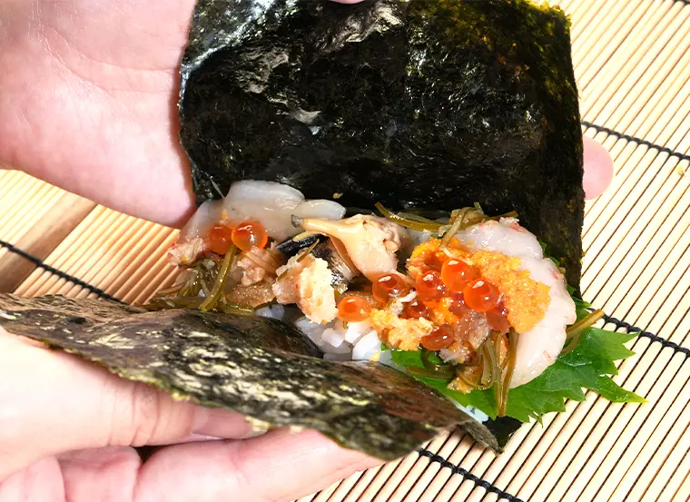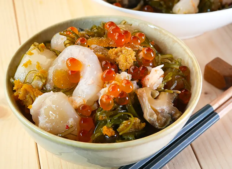 風味豊かな粘りのある昆布をベースに敷き、しっかりとした歯ごたえのつぶ貝・数の子、プリプリ食感のほたて、甘くてとろける甘えび、うに、プチプチ弾けるいくら、旨みのあるカニ身をバランス良く組み合わせました。